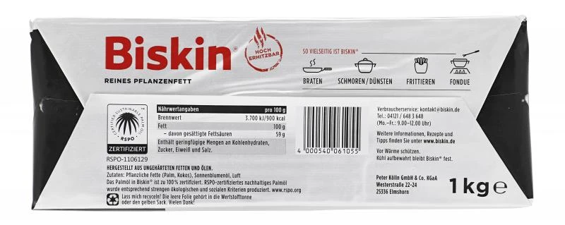 Artikelnummer: Y29TY 4503010056 Kategorien: Butter & Streichfett, Frische & Kühlung, Pflanzliches Fett, Speisefett & Schmalz Schlagwort: Biskin