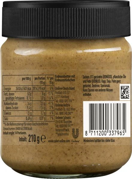 Erdnussbutter „Crunchy“ mit knusprigen Erdnuss-Stückchen im 210g Glas. Genießen Sie den herrlichen Erdnuss-Geschmack von Calvé Erdnussbutter. Sie ist viel mehr als nur ein Brotaufstrich. Die beliebte Erdnusscreme aus wertvollen, fein gemahlenen Erdnüssen eignet sich als Aufstrich für Sandwiches, als Zutat in Saucen, Marinaden, Kcuhen, Desserts und Gebäck sowie für warme Speisen. Probieren Sie die leckere Erdnussbutter mit gesunden Fetten und leckeren Erdnuss-Stückchen. Nussiger können Sie den Tag nicht beginnen. Wer Erdnussbutter mag, wird die Erdnussbutter von Calvé aus Holland lieben!