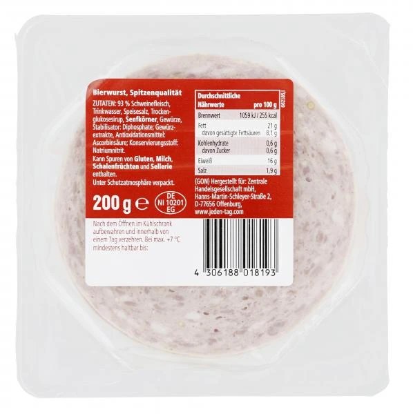 Artikelnummer: Y29TY 4505010763 Kategorien: Aufschnitt, Fleisch- & Wurstwaren, Fleischwurst & Mortadella, Frische & Kühlung Schlagwort: Jeden Tag