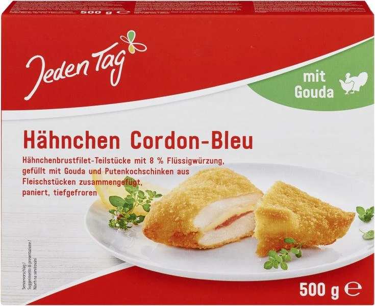 Hähnchenbrustfilet mit 8% Flüssigwürzung, gefüllt mit Gouda-Käse und Putenkochschinken, paniert, tiefgefroren. Einzeln entnehmbar.