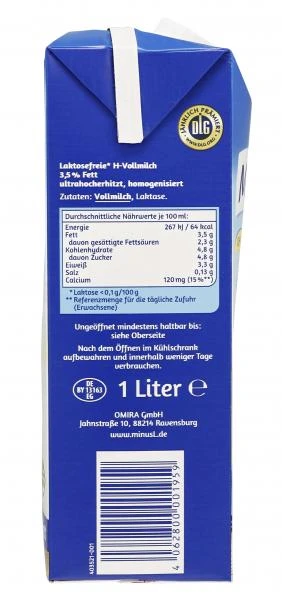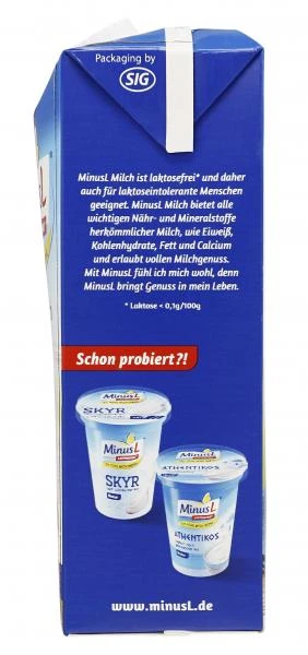 Minus L Milch ist laktosefrei (<0,1g/100g) und daher auch für laktoseintolerante Menschen geeignet. Minus L Milch bietet alle wichtigen Nähr- und Mineralstoffe herkömmlicher Milch, wie Eiweiß, Kohlenhydrate, Fett und Calcium und erlaubt vollen Milchgenuss.