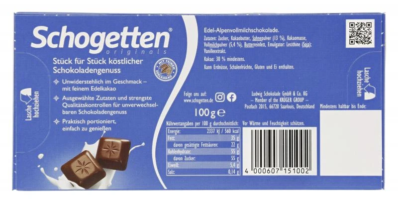 Artikelnummer: Y29TY 4502030006 Kategorien: Schokolade & Pralinen, Süßes & Salziges, Tafelschokolade, Vollmilchschokolade Schlagwort: Schogetten