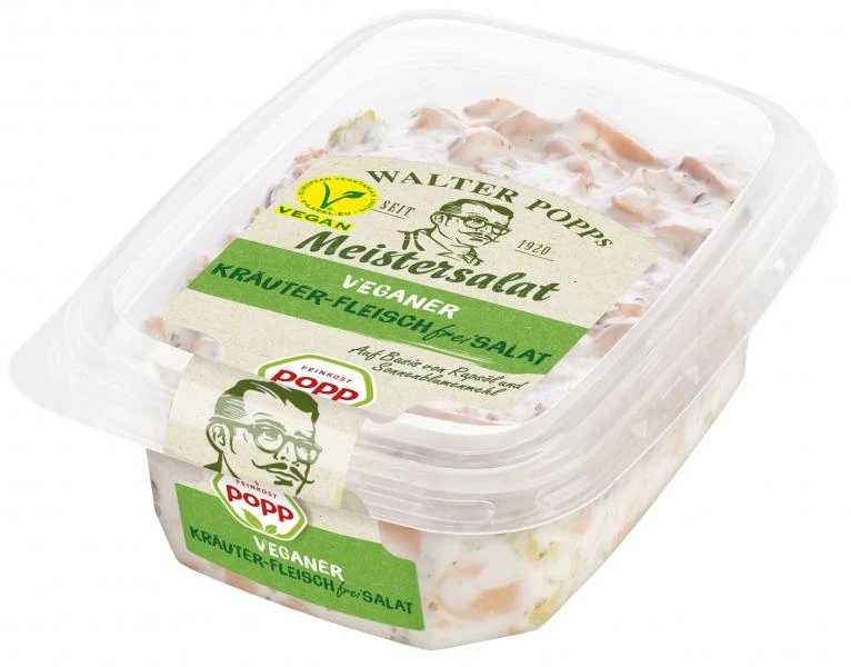 Mit dem neuen veganen Kräuter-Fleischfreisalat setzt Walter Popp mit einer guten Portion Kräutern noch einen drauf. Vegan & klimaneutral gestellt. Auf Basis von Rapsöl und Sonnenblumenmehl, verfeinert mit hausgemachter, veganer Salat-Mayonnaise.